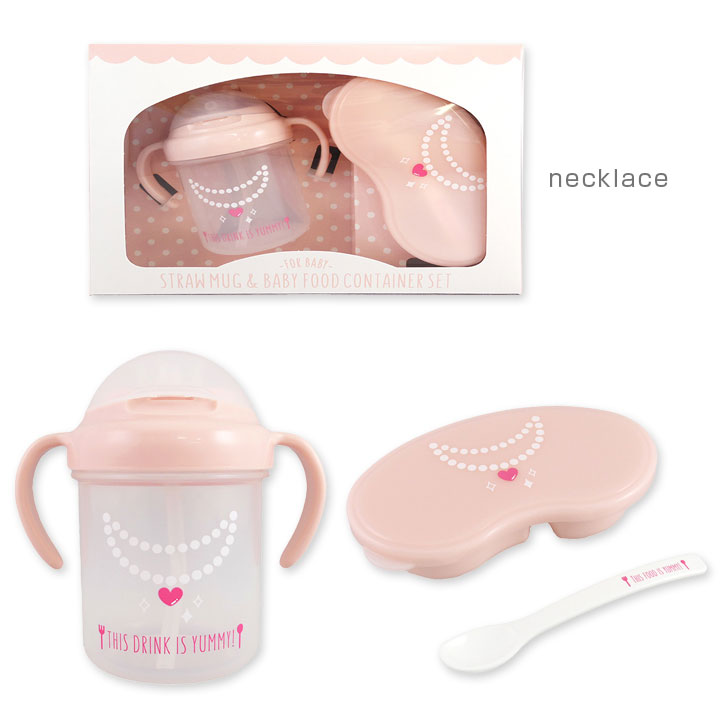 お友達への引っ越し祝い、出産祝いなど贈り物・ギフトにもおすすめ ▶Spec: お出かけ離乳食食器2点セット サイズ ストローマグ:Ф78×115×H117mm(260ml) 離乳食食器:145×77×H37mm ギフトセット 内容:ストローマグ、離乳食食器 箱サイズ:234×77×H172mm 素材 <ストローマグ> ストローフード、本体、フタ:PP、パッキン・ストロー・チューブ:シリコーンゴム ・すべての部品を外して本体部分のみ電子レンジで使用可能 ・食器洗浄機、食器乾燥機での使用は不可 <おでかけ離乳食容器> フタ:PE、本体、スプーン:PP ・フタ、スプーンは電子レンジでの使用不可 ・食器洗浄機、食器乾燥機での使用は不可 カラー ネックレス(ピンク)/ネクタイ(ブルー) 柄 ネックレス/ネクタイ 特徴・おすすめ 食器やマグは小さなお子様にも安心してお使い頂ける日本製だから 贈り物に喜ばれます。