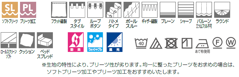SL ソフトプリーツ加工[形態安定加工]カーテンの裾の広がりを抑える加工を施した縫製仕様です。