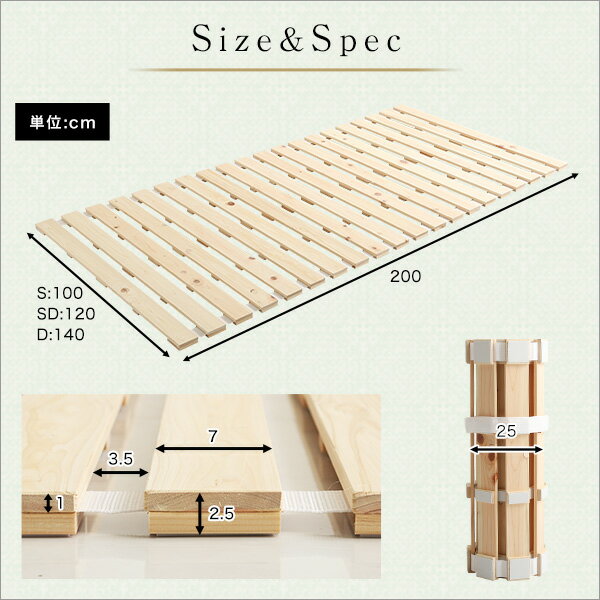 通気性バツグンのすのこベッド!材質はすのこベッドにおける最良の檜材を使用!頑丈な耐荷重180kg!丸めて簡単折りたたみ! 商品名すのこベッドロール式 檜仕様(ダブル) サイズ■商品サイズ:(約)140x200x2.5cm ■商品重量:(約)13.4kg 材質天然木材 檜(日本産) 備考完成品でのお届けです。